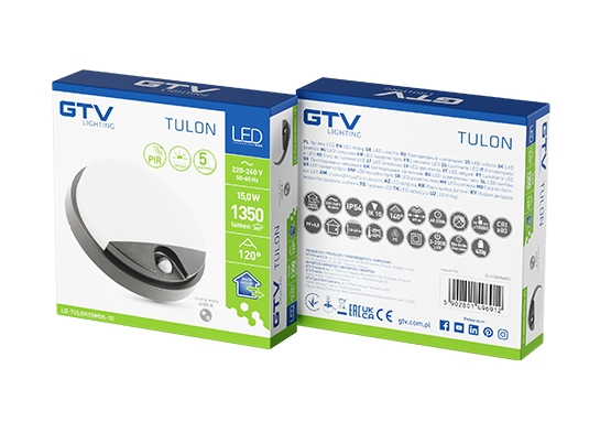 სანათი მოძრაობის და ღამის სენსორით TULON შავი, 15W, 4000K, ევროსერთიფიკატით, IP54, Ø210მმ., გარანტია 2წ, LD-TULON15WOK-10. GTV-496912